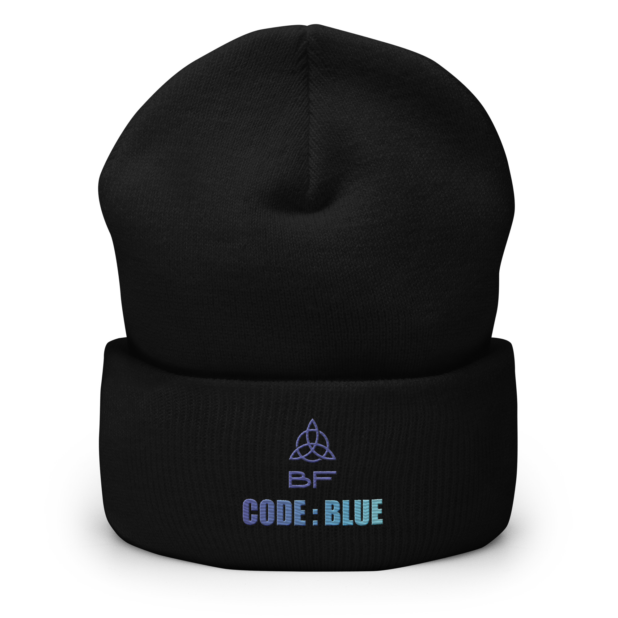 Cuffed beanie in Balanced Forces Code:Blue design with a slight color gradient embroidery.