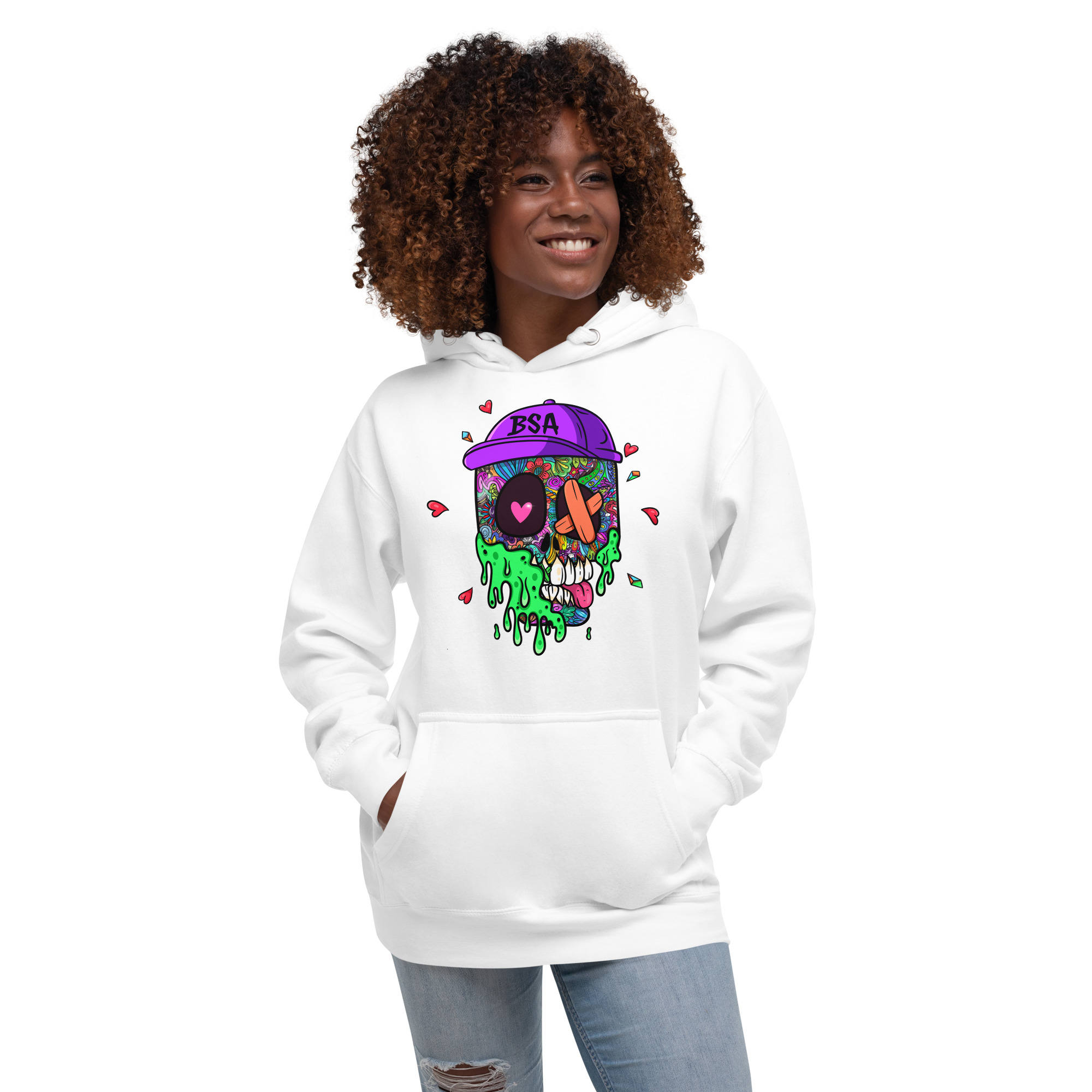 The BSA4 Hoodie White brings the bold Bored Skull Artists NFT artwork into modern streetwear. Designed for Web3 and crypto enthusiasts, this unisex hoodie offers a clean look and comfortable everyday wear.