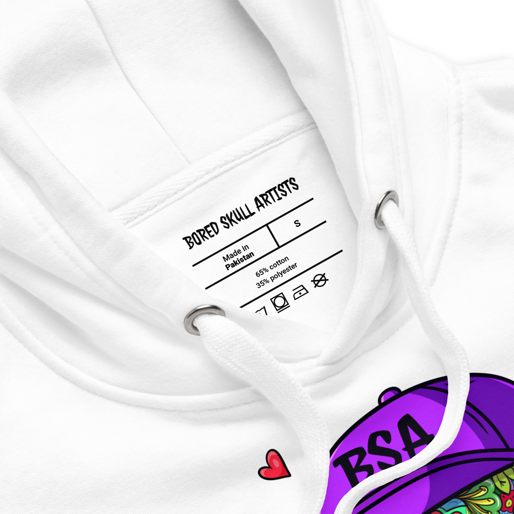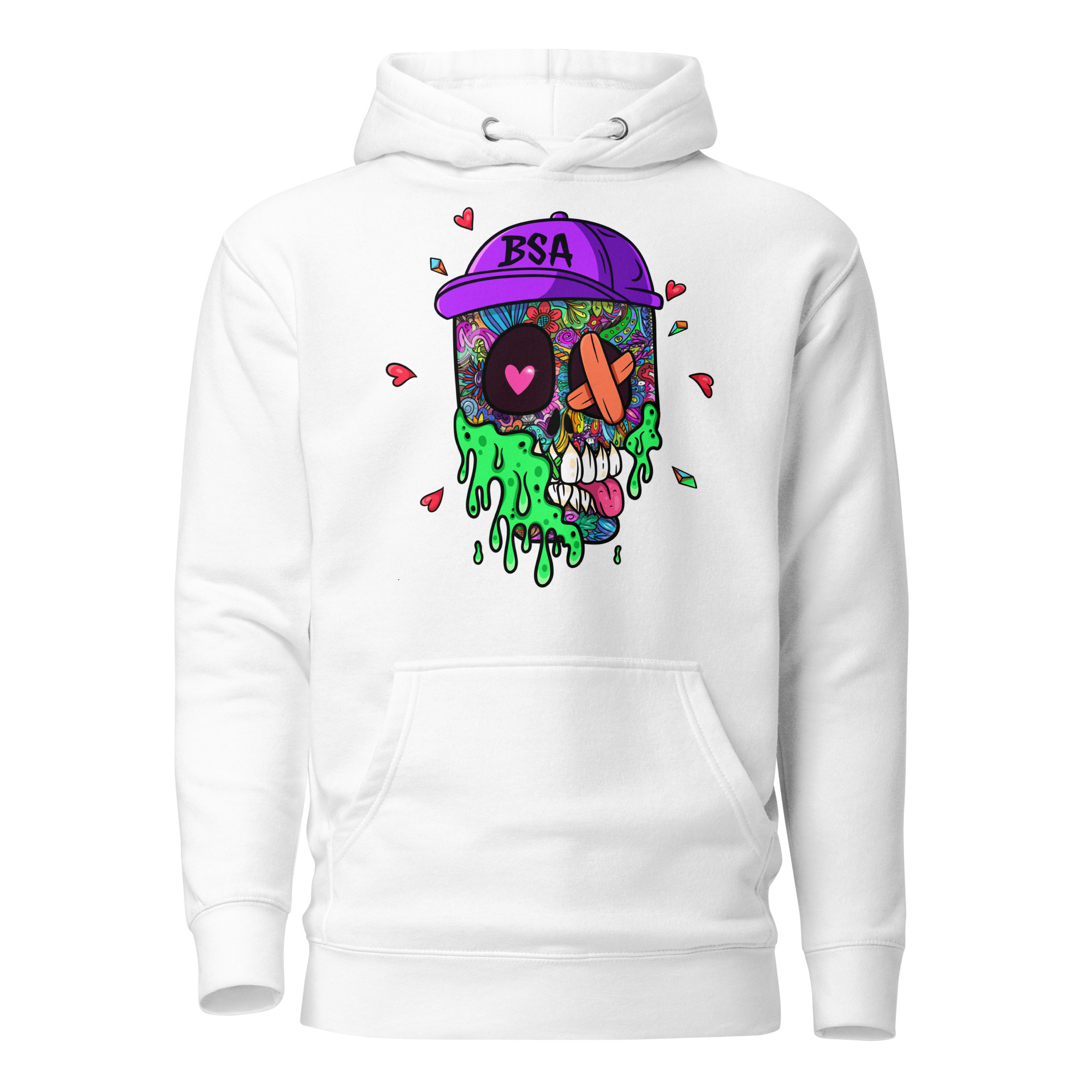 Wrap yourself in comfort and chaos. This crisp white hoodie is a blank canvas lit up with bold Bored Skull Artists artwork—streetwear that speaks louder than words.
