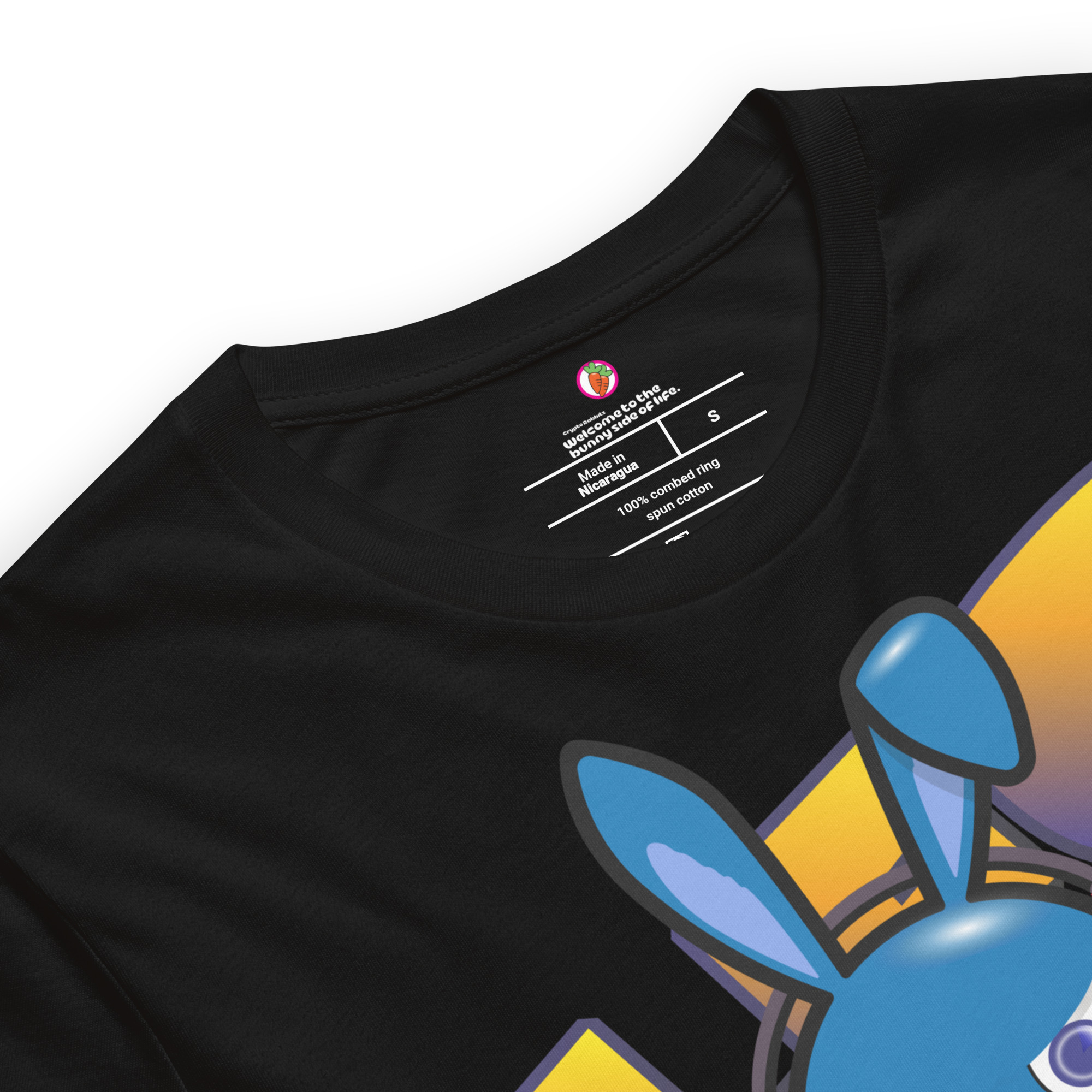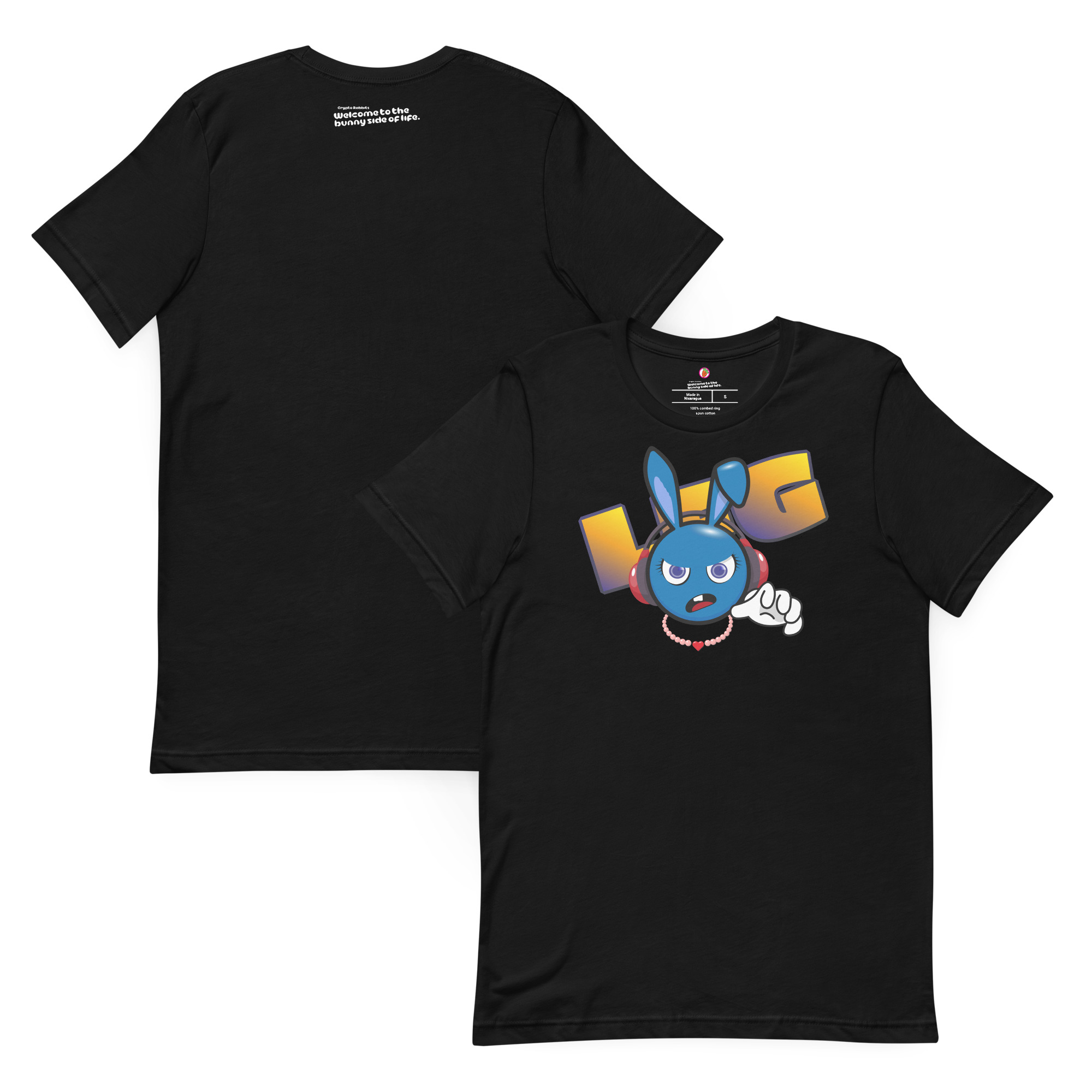 Iconic unisex high quality t-shirt. 100% certified organic cotton 180 gsm (5.3 oz/yd²) or 100% cotton 142 gsm (4.2 oz/yd²) with digital CryptoRabbits NFT prints at the front, back and neck (in- and outside).