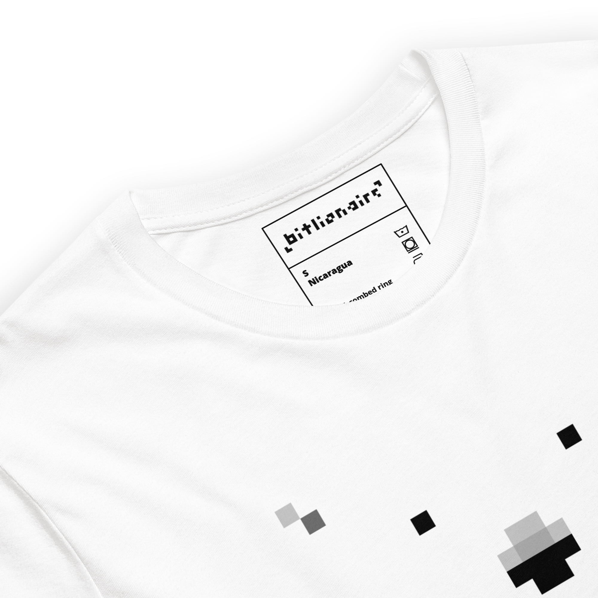 Fabric: Single jersey, organic cotton 180 gsm (5.3 oz/yd²) or classic cotton 142 gsm (4.2 oz/yd²). Bitlionaire NFT print on the front, back, and inside the neck.