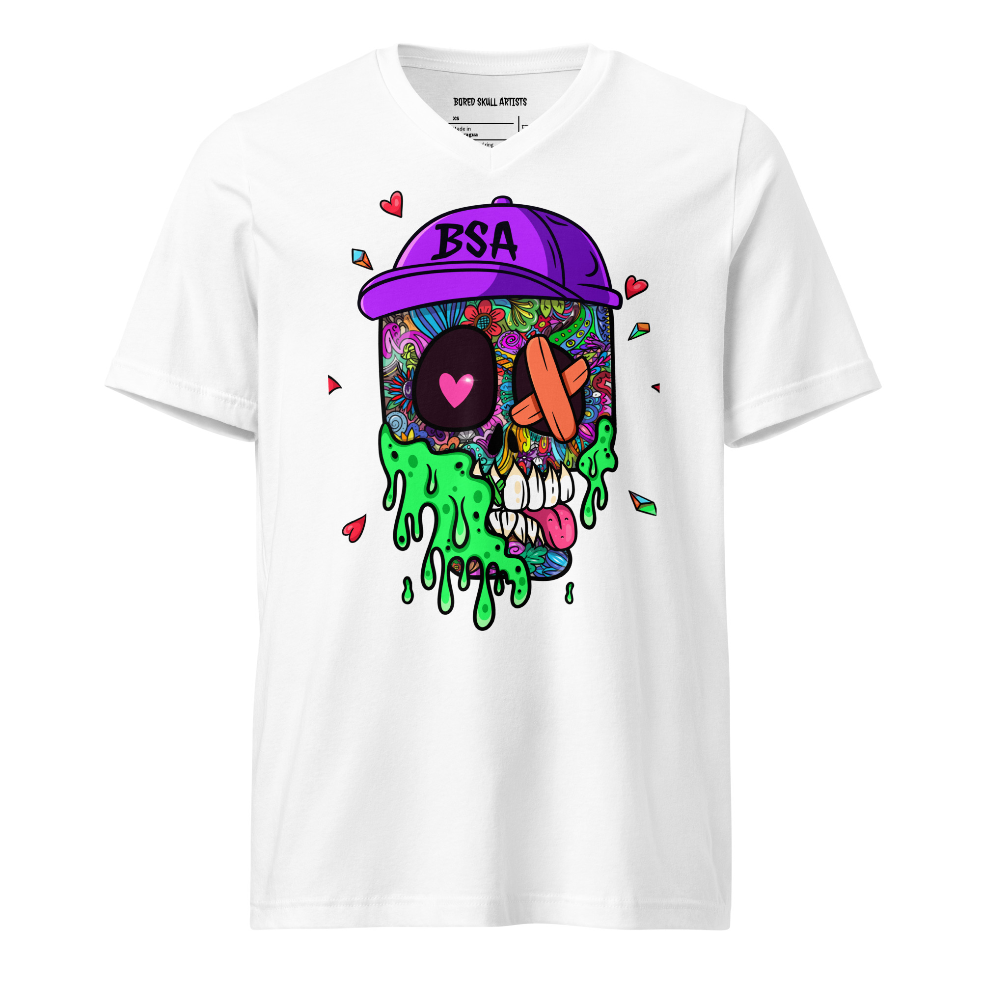 Iconic unisex high quality V-Neck t-shirt. 100% cotton 142 gsm (4.2 oz/yd²) with digital Bored Skull Artists NFT print at the front, back and inside the neck.